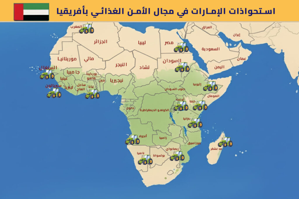 استحوذت الإمارات على أراضٍ زراعية بمصر وإثيوبيا وكينيا ومدغشقر والمغرب وناميبيا وسيراليون والسودان وأوغندا وتنزانيا. ونتج عن هذه الاستثمارات، التي غالبًا ما تكون ذات طبيعة استخراجية، آثارا بالغة على السكان المحليين والنظم البيئية. وفي كثير من الحالات، تُزرع محاصيل كثيفة الاستهلاك للمياه، مثل البرسيم، لإطعام الماشية في الإمارات العربية المتحدة والمملكة العربية السعودية، مما يُبيّن أن هذه الأنشطة لا تُعدّ استيلاءً على الأراضي فحسب، بل على المياه أيضًا.